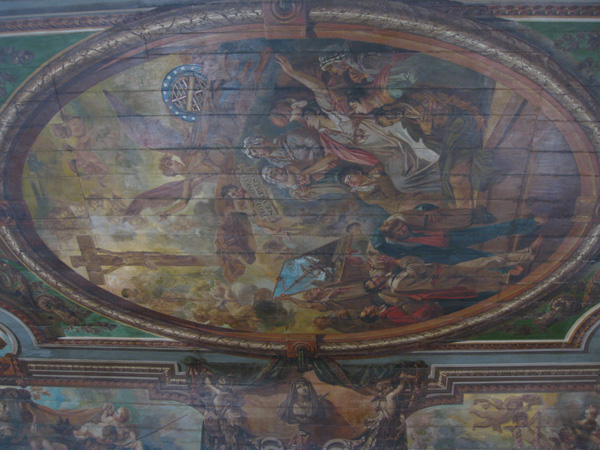 Het plafond van de kerk is versierd met rijkelijk beschilderd hout.