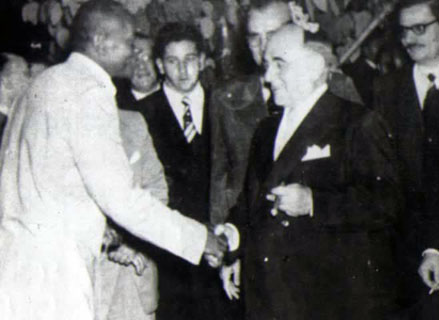 Mestre Bimba die de hand schudt van President Getulio Vargas die een jaar