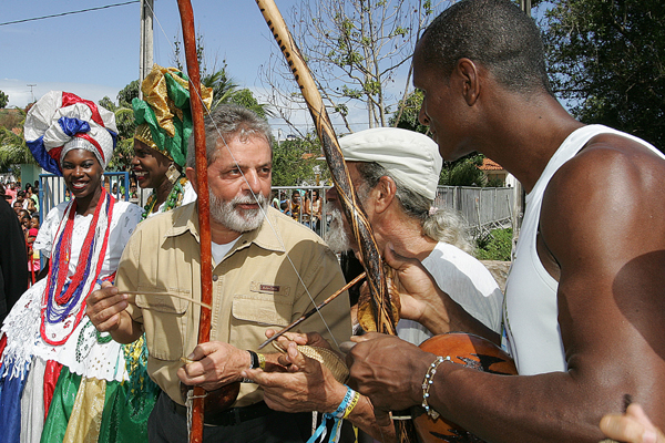 President Lula op de berimbau op 21 maart 2006 in Lauro de Freitas, Salvador