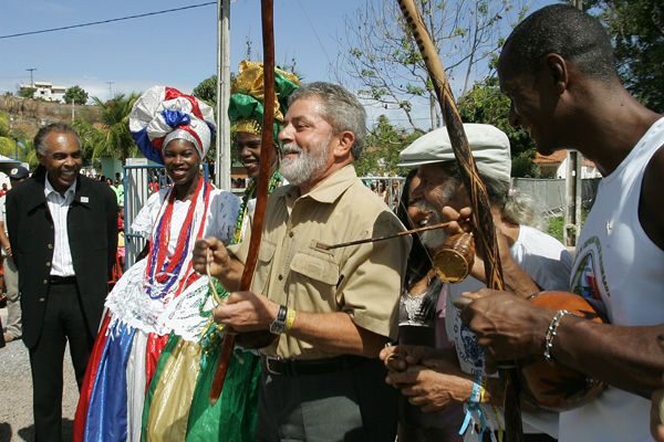 President Lula onder toeziend oog van de toenmalige minister van cultuur en